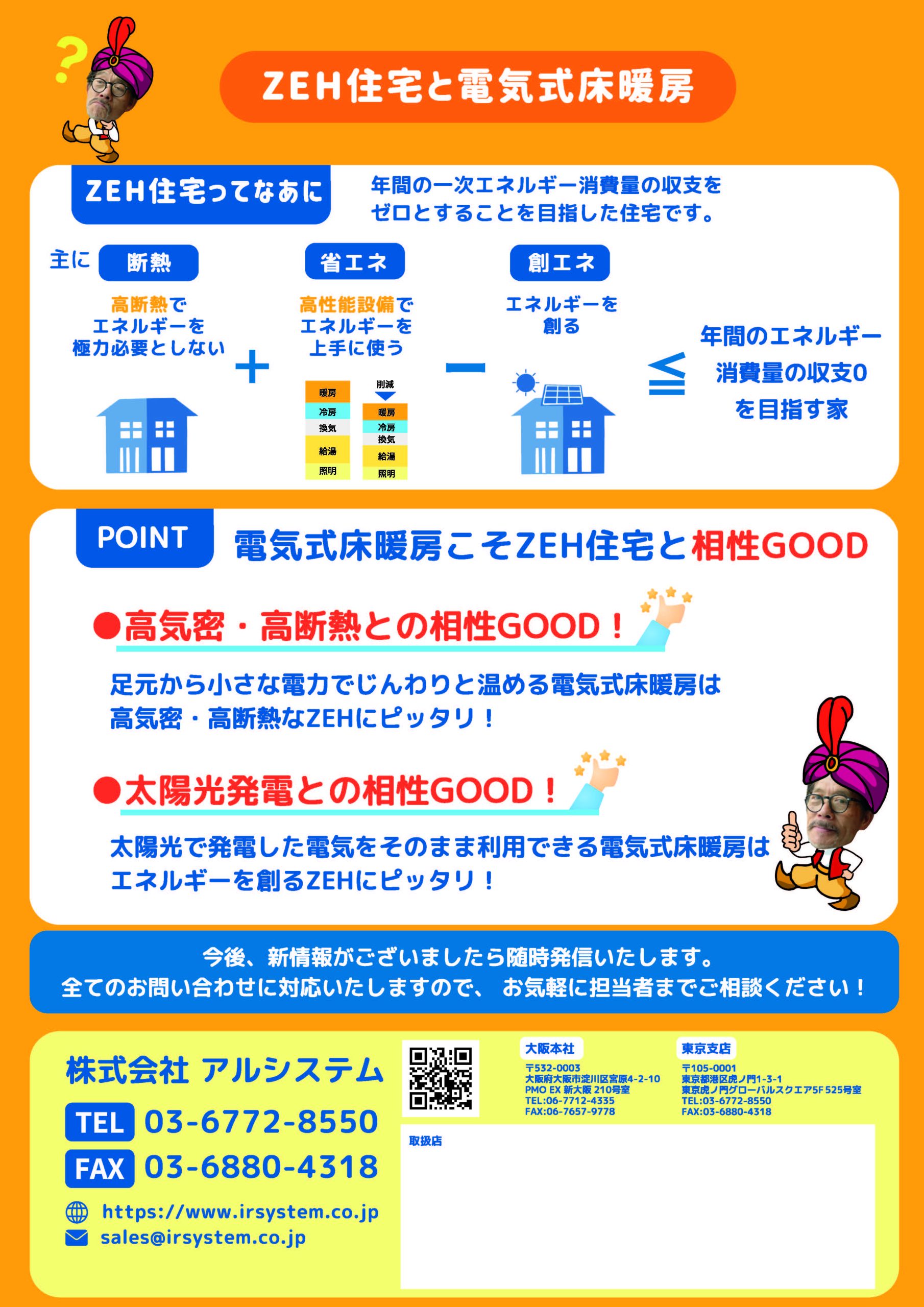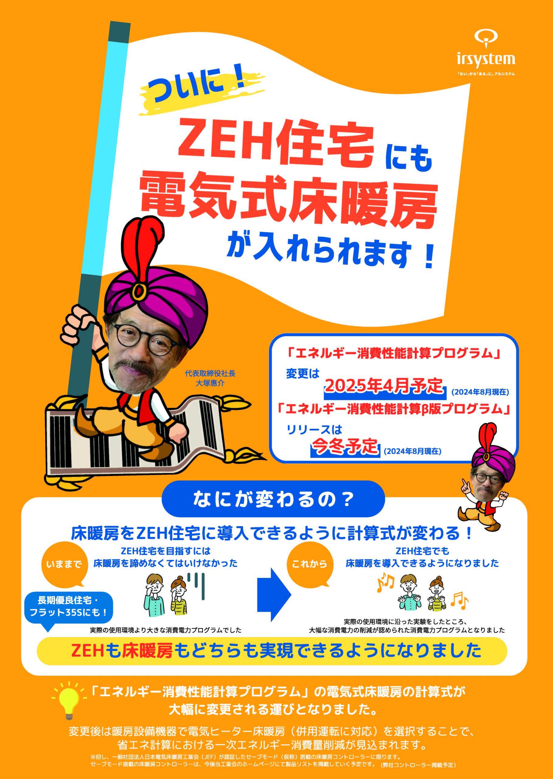 製品情報 ZEH住宅にも電気式床暖房が入れられます! 2024.08.19 「エネルギー消費性能計算プログラム」の電気式床暖房の計算式が大幅に変更される運びとなりました。 変更後は暖房設備機器で電気ヒーター床暖房(併用運転に対応)を選択することで、 省エネ計算における一次エネルギー消費量削減が見込まれます。 詳しくは添付のチラシをご覧ください。 ※但し、一般社団法人日本電気床暖房工業会(JEF)が認証したセーブモード(仮称)搭載の床暖房コントローラーに限ります。セーブモード搭載の床暖房コントローラーは、今後当工業会のホームページにて製品リストを掲載していく予定です。 (弊社コントローラー掲載予定)