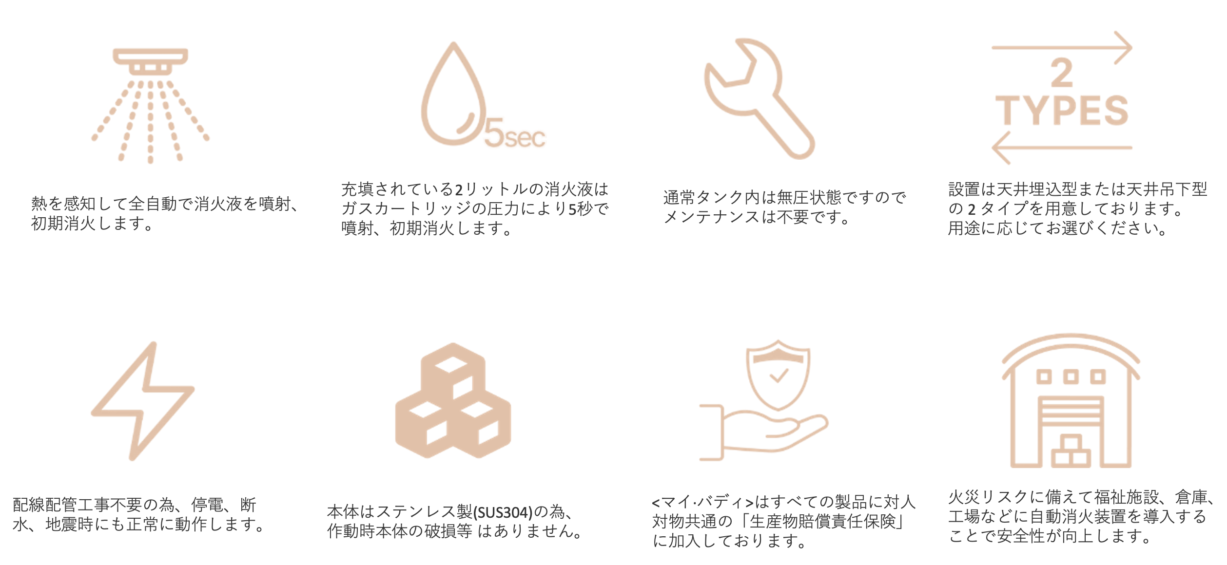火災をいち早く察知し、消火液の集中噴射によって一瞬で初期消火を行える全自動消火システムです。